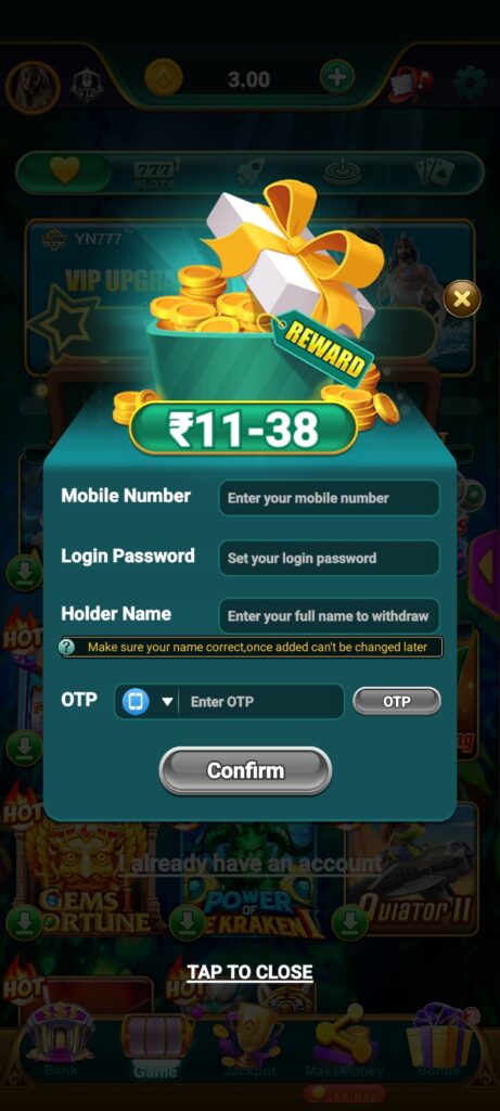 Click on the download button and install it after opening it and login by entering your mobile number OTP passport and then claim the bonus and get it. You can play other games with the bonus money.200%.